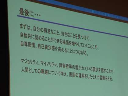 道徳授業地区公開講座22 1 月11日(土) 公開日 2025/01/14 更新日 2025/01/14 できごと 全く聞こえない世界で生きてきた伊賀崎さんが、最後に伝えてくれたこと「一人の人間としてリスペクトすること」このことが、心にズドンと突き刺さりました。たくさんのつらい思いもあった中、くじけず、粘り強く、自分の声で話ができるまでに、想像もできない努力があったのだと思いました。 母なくして、今の自分はいないと、おっしゃっていました。 質疑応答の時間も少しだけありました。 いいね(0)