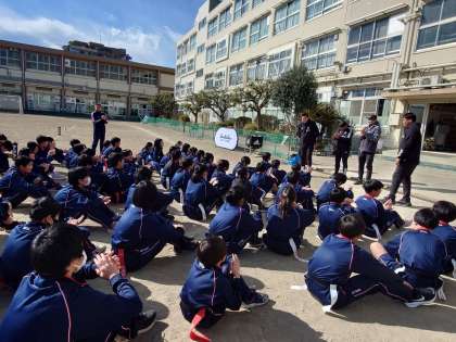 タグラグビー体験授業12 2 月6日(木) 公開日 2025/02/08 更新日 2025/02/08 できごと 給食、昼休みを挟んで、5時間目最後の授業です。 給食の後、放送委員の協力で、ブラックラムズの宣伝をしてもらいました。試合の招待のポスターが校内に貼ってあるので見て応募してみてください。直接ラグビー迫力あって面白いです。 いいね(0)