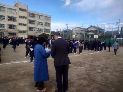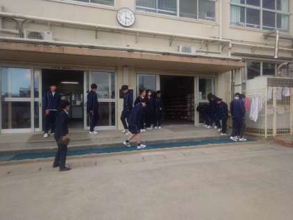 最後は、美化委員が雑巾を用意してくれて、校内が汚れないように注意喚起してくれました。体育館と併用になったので、しっかりと土を落として入ってください。