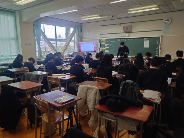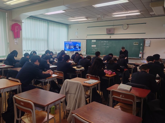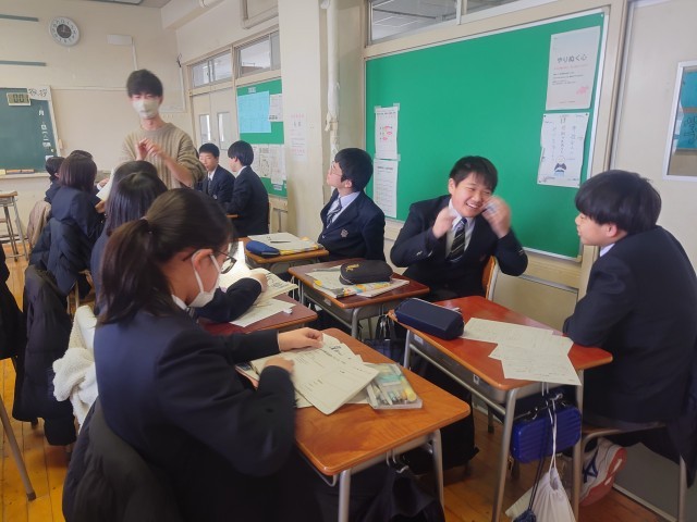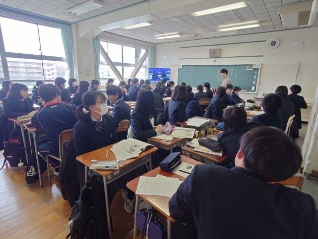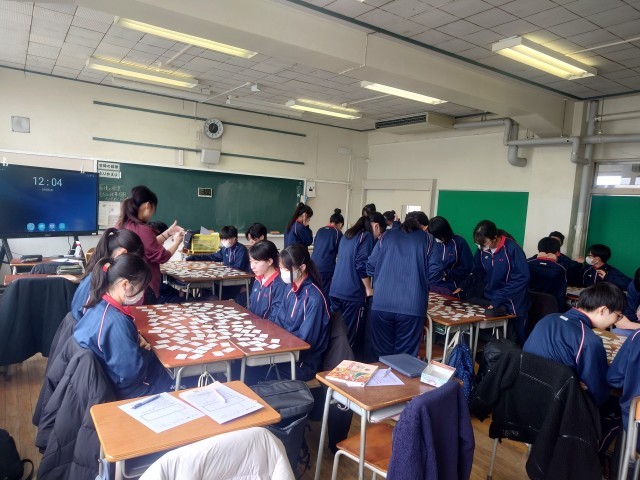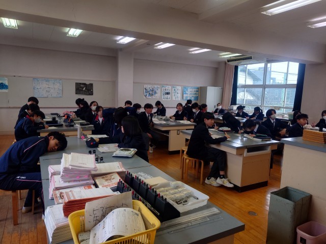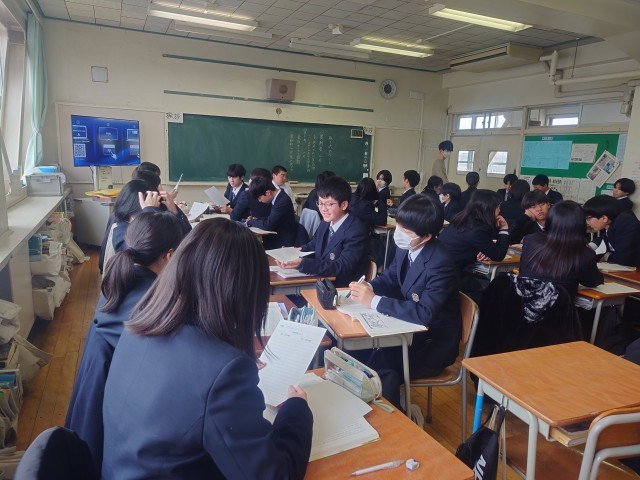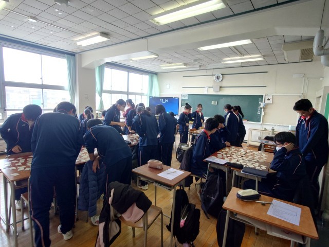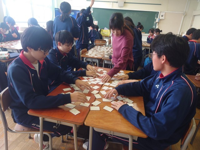 3年生国語の時間、百人一首をやっていました。花田先生が読み手です。生徒の気合がみなぎっていました。2年生少人数英語、国語の授業は、ディベートの準備、役割分担中。