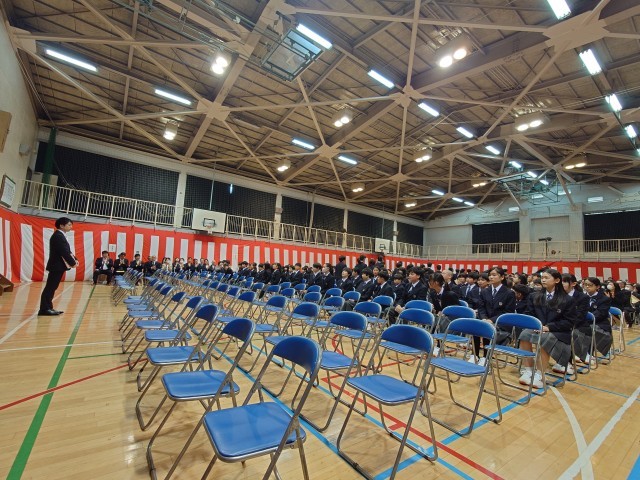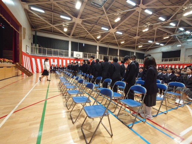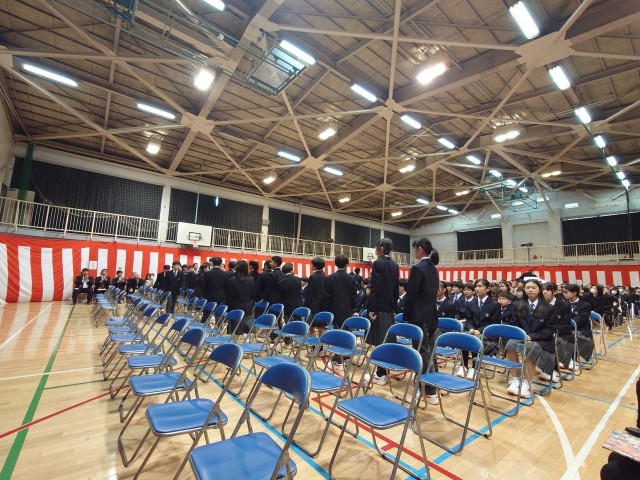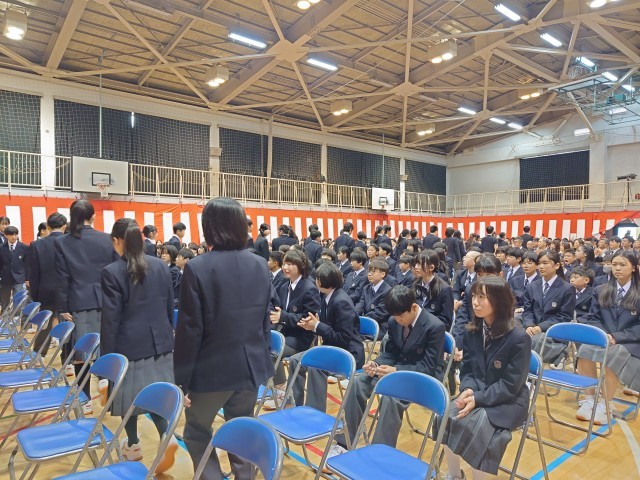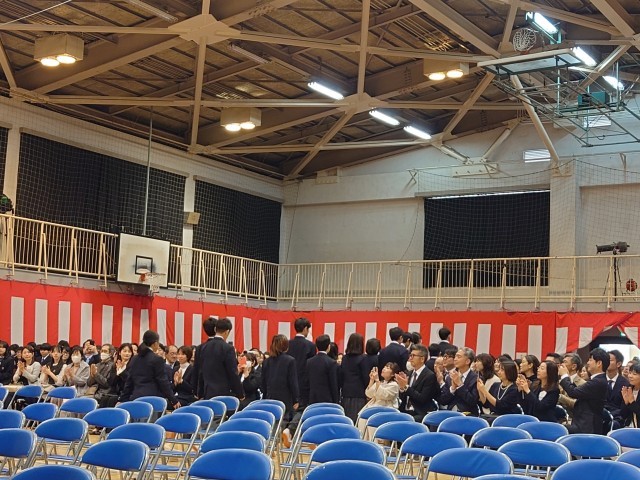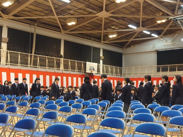 入学式5 4月8日(火) 公開日 2025/04/09 更新日 2025/04/09 できごと 新入生退場です。立派な入学式でした。お疲れ様。保護者の皆さまへ、学年主任からご挨拶、各担当からの諸連絡があり、最後が写真撮影でした。明日から本格的な中学校生活が始まります。よーい、どん!! +4 いいね(1)