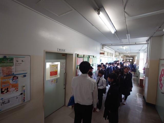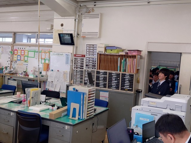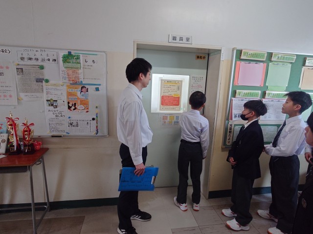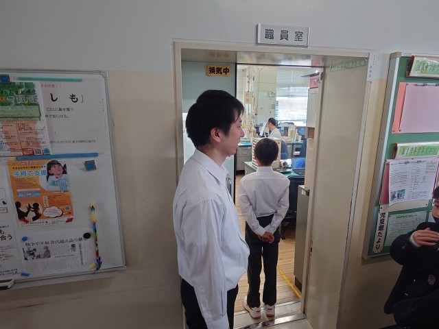 1年生校内巡り。職員室の入り方を練習中。