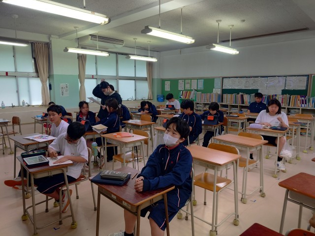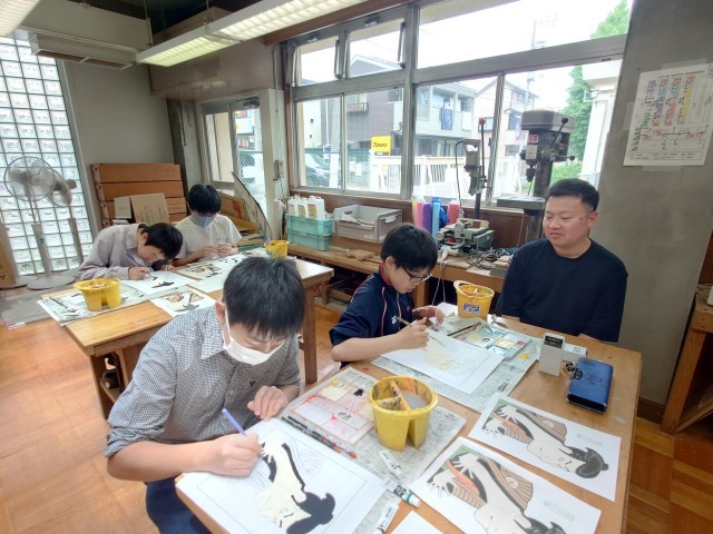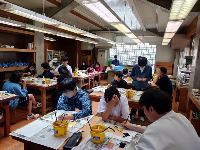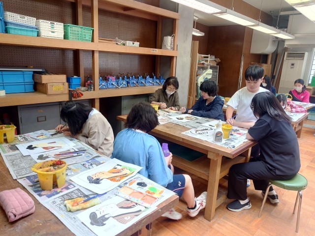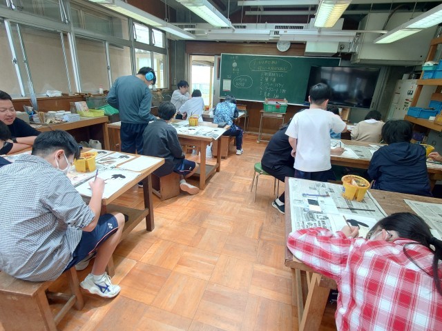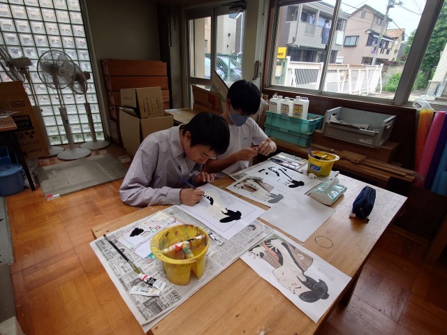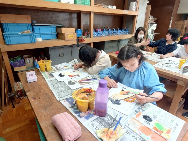 一つのグループは、日本画の模写の色付けをしていました。細かいところまで丁寧に着色できました。もう一つのグループは、Tシャツのデザイン画を考えていました。みんな上手です。
