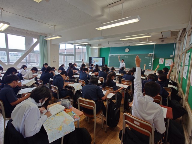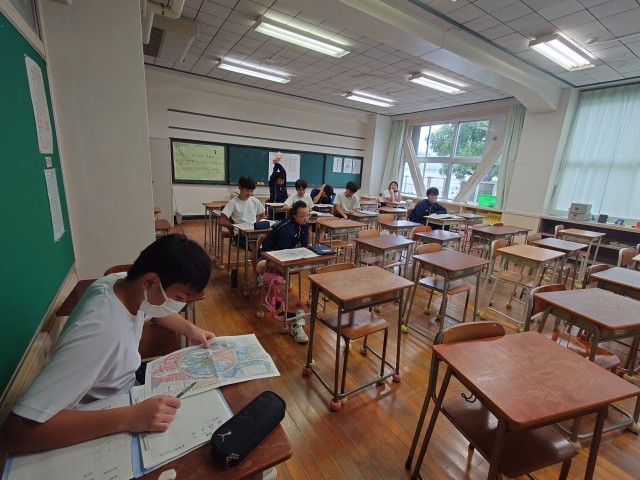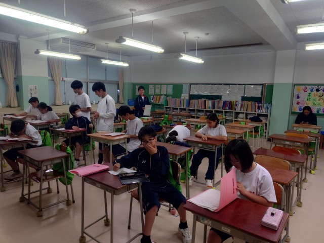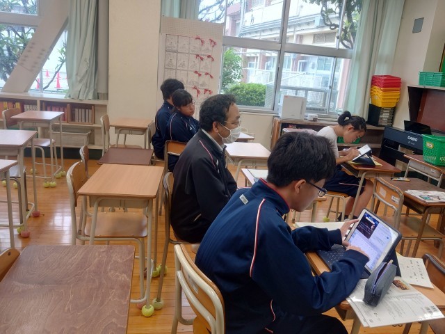 I組の授業。3年生は修学旅行の万博の見学場所を決めていました。楽しそうです。