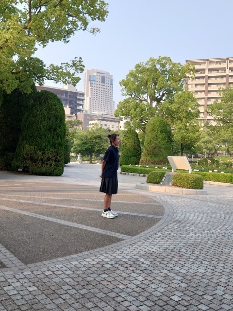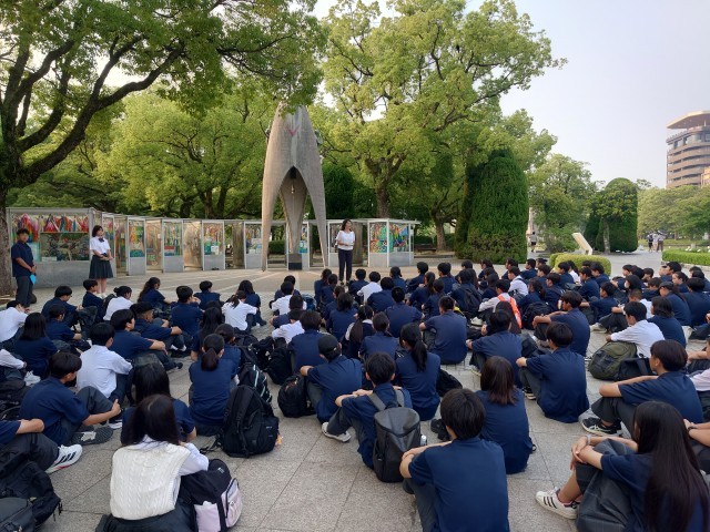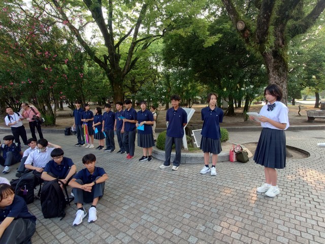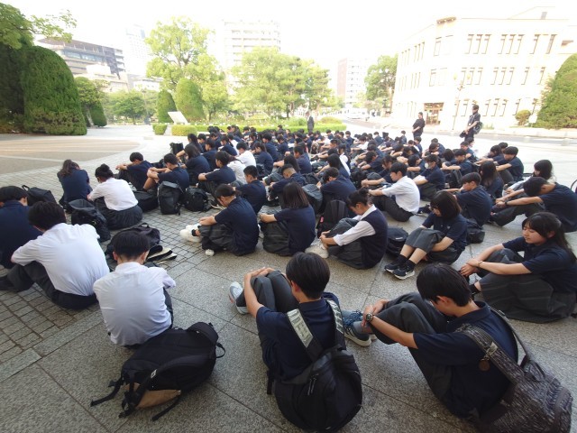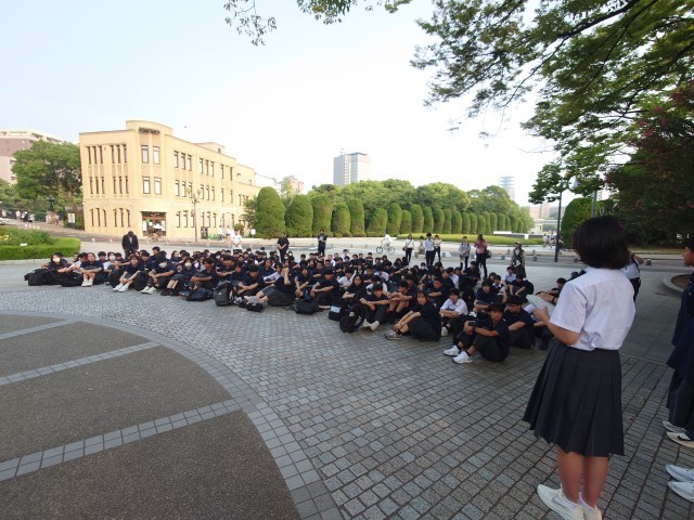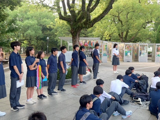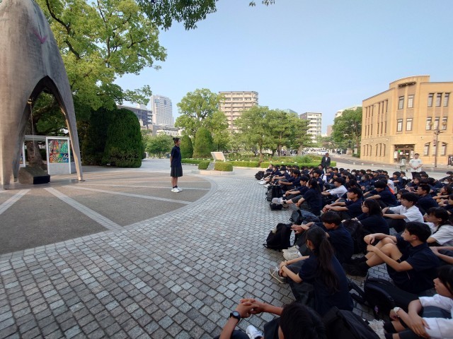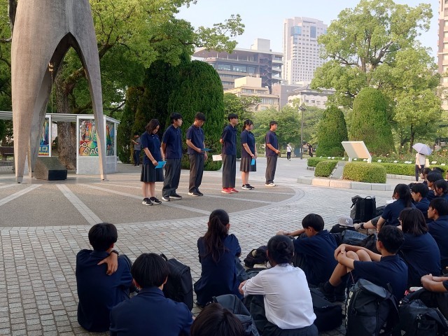原爆の子の像の前で、弦巻中学校平和集会を行いました。平和公園を見学し、さらなる原爆資料館で学びを深め、被爆体験のお話を聞いて、今どんな気持ちでいるのでしょうか。