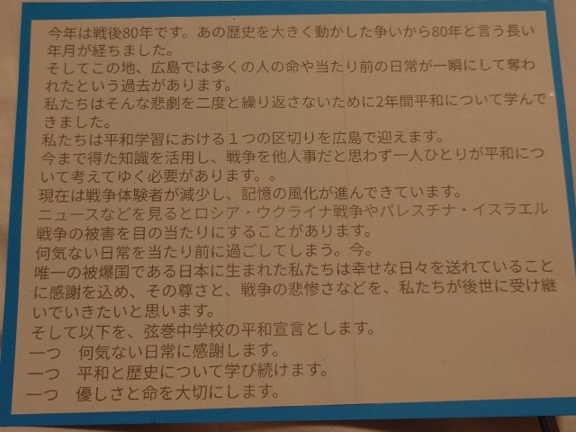 平和集会を広島で、皆さんでむかえられたことに、私は感動しています。平和宣言を大きな声で読み上げました。