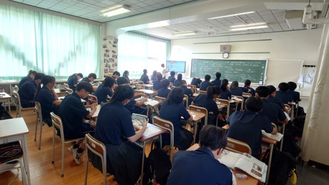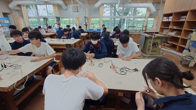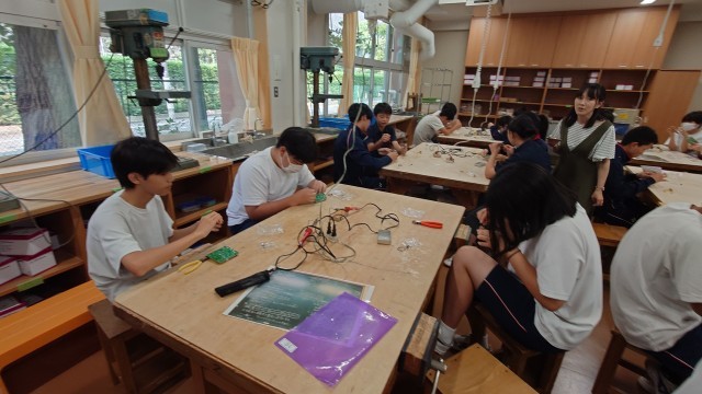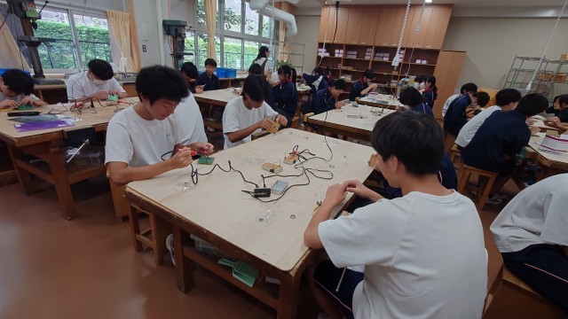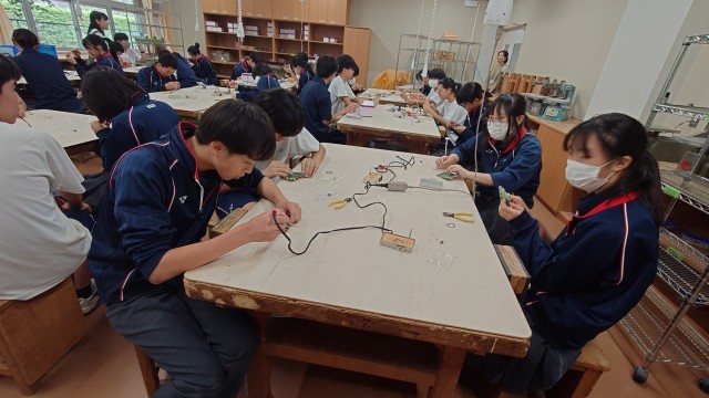 3年生、技術の授業。真剣にはんだごてを使って、作業中。