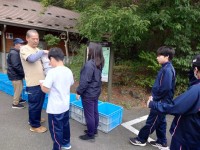 コウモリ穴いってらっしゃ~い。コウモリ穴に入らない子どもたちは、クニマス資料館の...