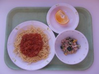 2月9日の献立・牛乳・ミートソーススパゲティ・ビーンズサラダ・果物(いよかん)