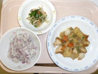 4月21日(火)の給食牛乳ごはん吉野汁いかのかりんと揚げ野菜の辛子和え