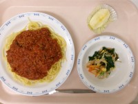 4月24日(金)の給食牛乳スパゲッティミートソースほうれん草とコーンのサラダ果物...