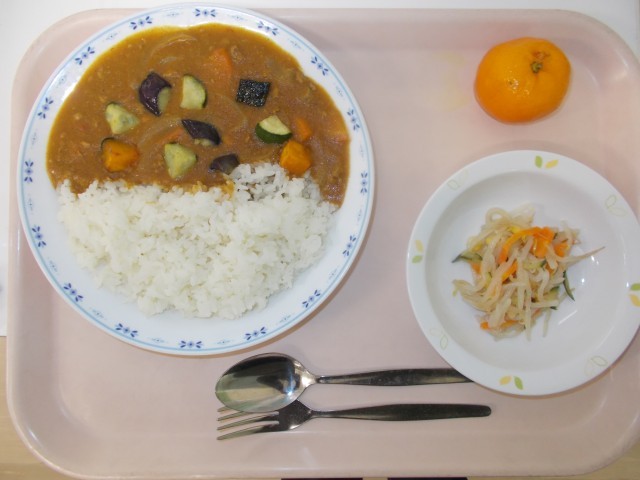 コーンの入ったサラダ、デザートには希望が多かった冷凍みかんです。