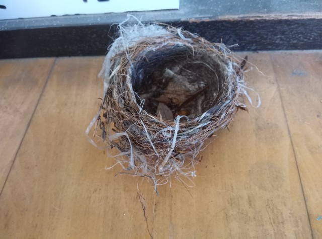 校庭で見つかった鳥の巣です。写真では分かりにくいですが木の枝、皮の他にビニールテープのような物も利用して作られています。鳥の巣があると幸運の前触れとも言われています。