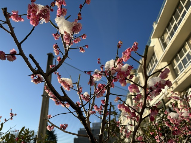 写真は今月の上旬に、雪が降った日の翌日の梅の花です。