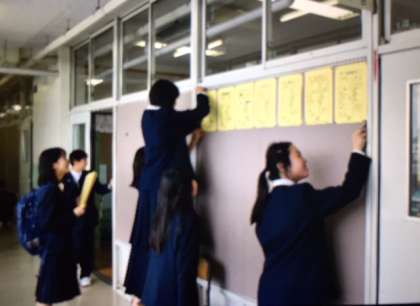 係生徒も早速活動をしています。放課後、掲示係が『自己紹介カード』や『一学期の目標』を丁寧に掲示していました。