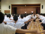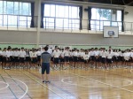 本日、体育祭の全校練習の1回目が行われました。あいにくの雨天でしたが、体育館でしっかり取り組むことができました。今回は、体操と応援席からの入場の練習を中心に行いました。また、校歌の練習では団長達が素晴らしい歌声を披露してくれました。