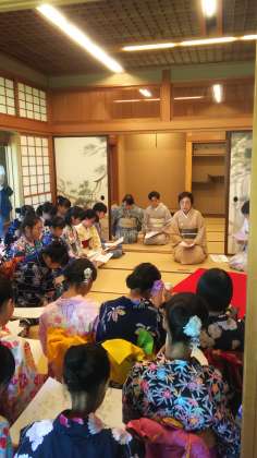 暑い陽射しの中、羽根木公園の星辰堂で三校合同のお茶会をしています。普段とは違う装いに気持ちもすっきりと参加しています。
