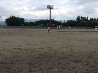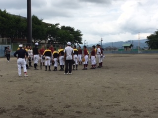野球部は、地元の中学校と合同練習をしています。大きな声が球場内に響いています。