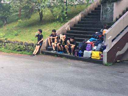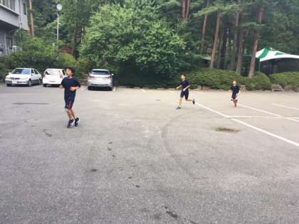 練習を終え、各部続々とホテルに戻ってきます。多くの生徒が、山のふもとの体育館から、登り坂を走って戻ってきます。ゴールに着くと、美味しい牛乳をいただきます。