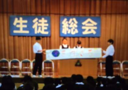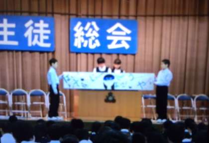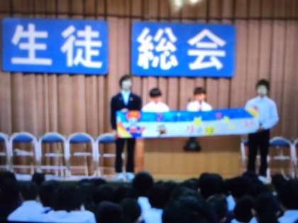 1学期にクラス毎に決めた「学級目標、授業規律に関する取組、いじめ防止に関する取組、SNSルール」について、クラスの状況を振り返り、まとめたものを代表者が発表しました。
