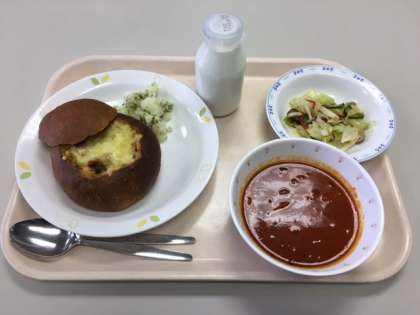 生徒の皆さんが食べたバンは、給食室で調理員の皆さんが一つずつバンをくり抜いてくださったのだそうです。ありがとうございます。