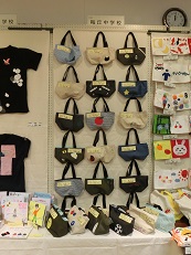 技術、家庭科の作品展示風景です。技術の作品は「キーホルダー」、家庭科の作品は「ランチトート」です。