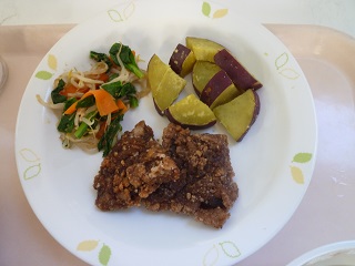 ・ごはん ・吉野汁 ・くじらの竜田揚げ ・野菜のおかか和え ・ふかしさつまいも