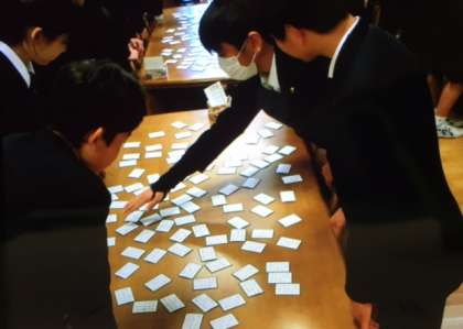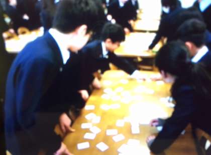 3学期に入ってから、1学年では『百人一首の暗唱カード』が使って暗唱にチャレンジしてきました。昼休みや放課後には暗唱した句を聞いてもらおうとズラリと列ができるほど、みんなで前向きに取り組むことができました。