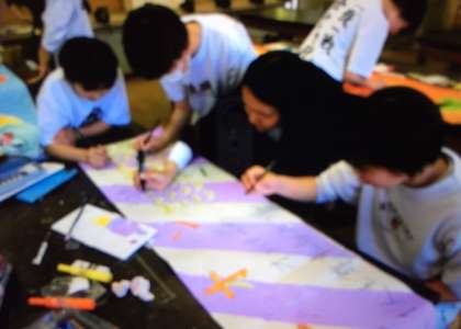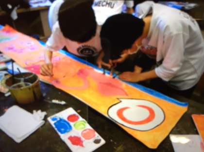 放課後に、学級目標の作成担当生徒が活動しています。クラスカラーや目標を元にデザインし、模造紙にカラフルに描いていました。