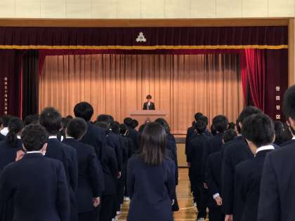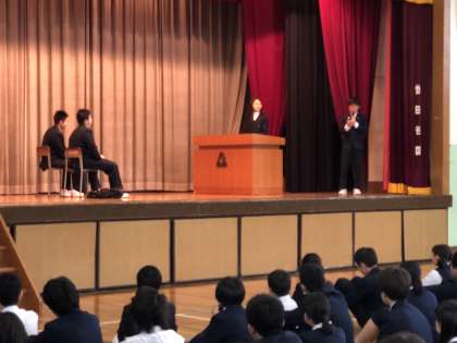 今朝の生徒会集会では、生徒会の本部役員がチャイム着席の呼びかけをしました。その際、自分たちが考えた寸劇をいれながら、1年生にもわかりやすく説明していました。