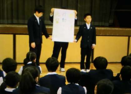 生徒会集会の後、2年生は学年集会を行いました。2学年の学級委員会が作成した学年スローガンは「自分達から行動できる先輩になる」です。