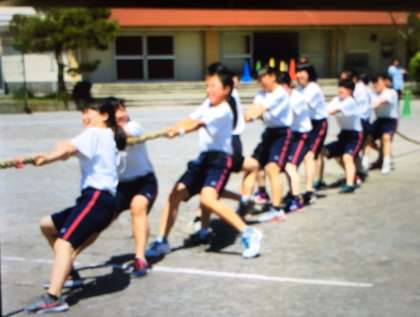 女子が綱を引き合う中、男子が校庭を走ってから自分のクラスに加わります。