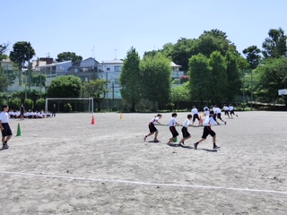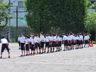 1年生の体育祭学年練習が行われました。快晴の中、学年種目の台風の目、リレーや大縄跳びの練習を行いました。台風の目では、細かいルールを確認していました。