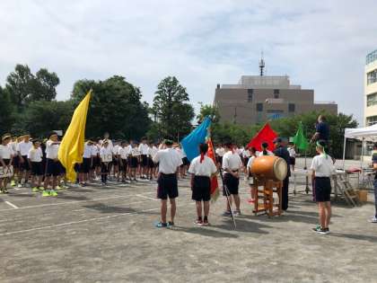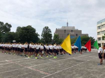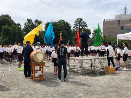 体育祭予行練習を行なっています。開会式の練習、選手宣誓の練習をしています。どの団もキリッとハチマキを締めてかっこいいですね。