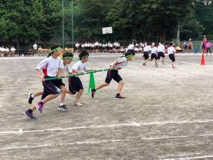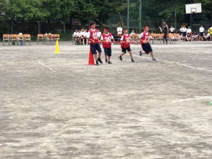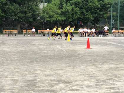 1年生学年種目、台風の目です。遠心力に負けないように頑張ってコーンを回っています。