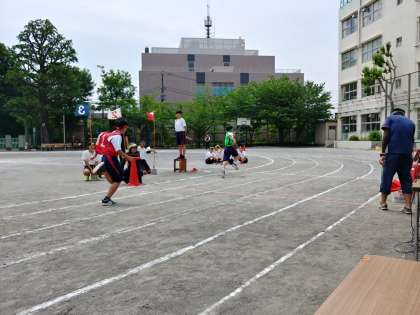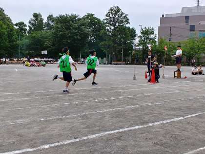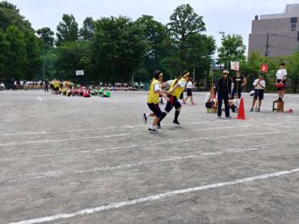 中学生になって初めて全員でバトンをつなぎます。練習では、ミスなくつなぐことができました。
