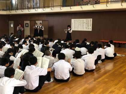 1年生は、28日から2泊3日で河口湖移動教室へ出かけます。今日の6時間目は、学年集会がありました。各係からの連絡の後、整列の練習、先生からの話がありました。安全で楽しい移動教室にするには、一人ひとりが時間を守り、少しずつの我慢をして、自分のわがままを通すことなく過ごしましょう、とのお話がありました。