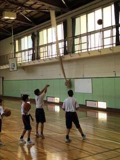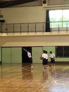 1年生男子は体育の授業でバスケを行っています。フリースローの練習をしています。