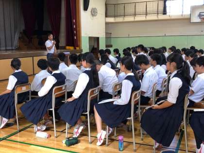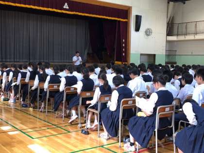 3年生と保護者対象に、第1回進路説明会を行っています。自分の進むべき路、生徒はしっかり聞いています。