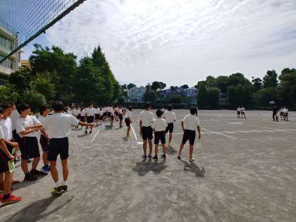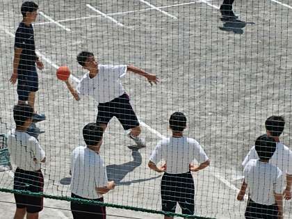 校庭では、ハンドボール投げを行っています。