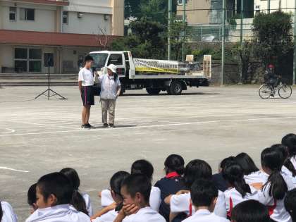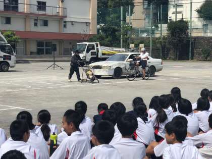 横断歩道を乳母車を押した人が横断しています。車は止まってくれましたが、その脇から猛スピードで自転車が通過します。悪い例に続いて、梅中生が良い例を示しました。
