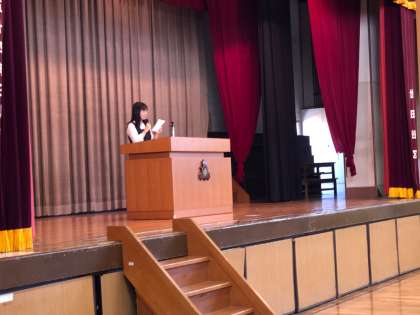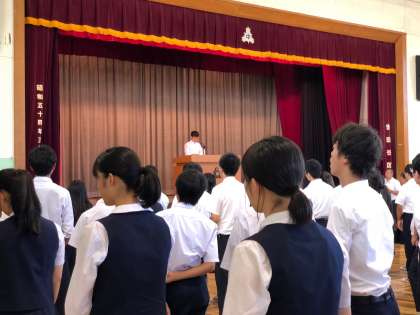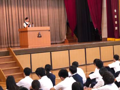 避難訓練に引き続き、生徒会朝会が開かれました。生徒会長からは、7月3日から6日にかけて行うペットボトルキャップ回収大会に関して、実施のルール、集めたキャップをどのように活用していくのかの説明がありました。選挙管理委員会からは、生徒会選挙の公示について、規律委員会からは7月2日〜6日にかけて行う「授業態度点検」についての話がありました。生徒たちはみんな真剣に話を聞いていました。
