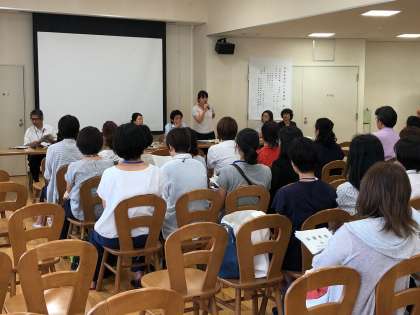 授業が終わり、協議会を行なっています。指導案作成者と授業者の代表が今日の授業についての話をしています。