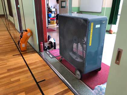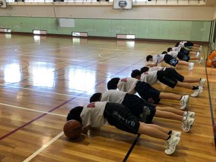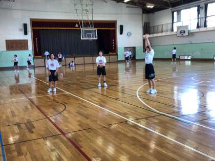 バスケット部女子が練習をしています。気温に合わせて、体に無理のない練習メニューを組んで進めています。大型扇風機も大活躍です。