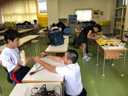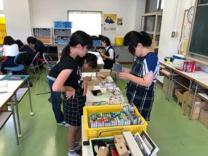 今日から1週間は、学び舎小学校部活動体験です。今日は美術部、演劇部、テニス部で行なっています。写真は、美術部の活動の様子です。ステンドグラス作りや、折り紙にチャレンジしています。