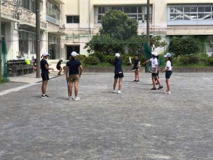 テニス部は、上級生が、参加した小学校に丁寧に素振りを教えたり、ボレーの相手をしたり、球出しをしたりしていました。暑さに負けずに頑張っていました。