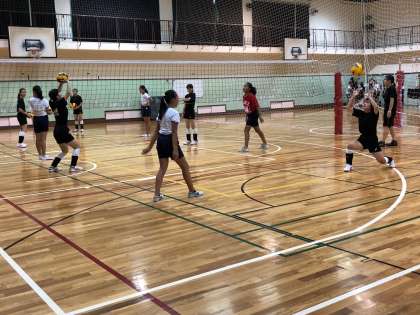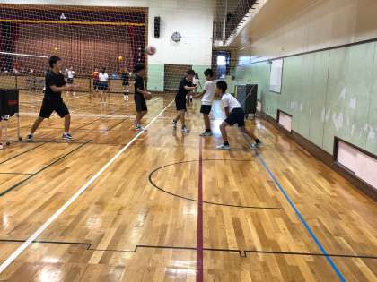 バレーボール部の体験入部をしています。女子は1.2年生と一緒にオーバーパス、男子は3年生からアンダーレシーブのやり方を教えてもらっています。