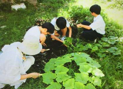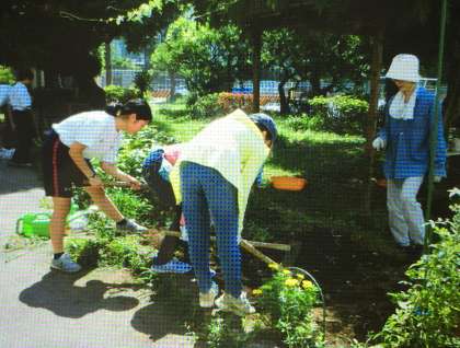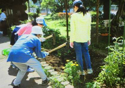 園芸部の体験入部をしています。道具の使い方などを教わりながら、野菜の収穫や草引き、土を耕すなど、暑い中頑張っていました。