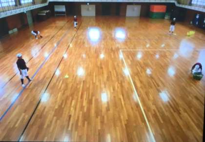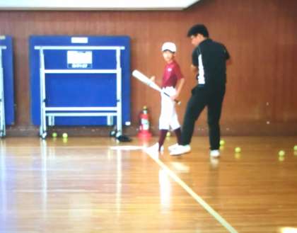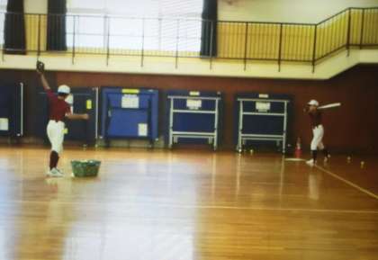 野球部は格技室に練習場所を移して活動しています。顧問の先生に教えてもらいながら、バスターの練習をしていました。