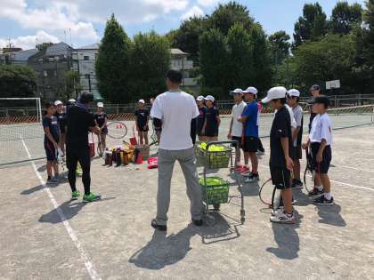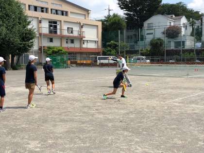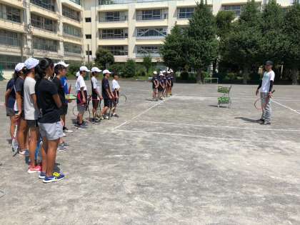テニス部は、ウインザーラケットショップからコーチをお招きして、テニス講習会を行っています。ラケットでボールを打ち出すタイミングのアドバイスや、球出しをしていただいたりして、生徒たちは暑さに負けずに熱心に練習に参加しています。
